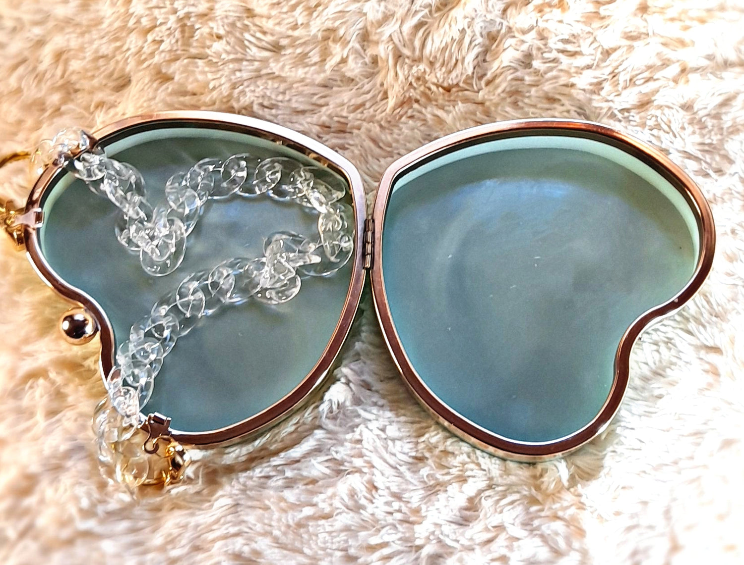 Heart Shaped Handmade Resin Clutch Purse using Non-toxic resin that has the durability to last up to 25 years.(1)Gold Strap/Purse chain included with purchase. Clear Acrylic Purse strap(in photo) sold separately on website.