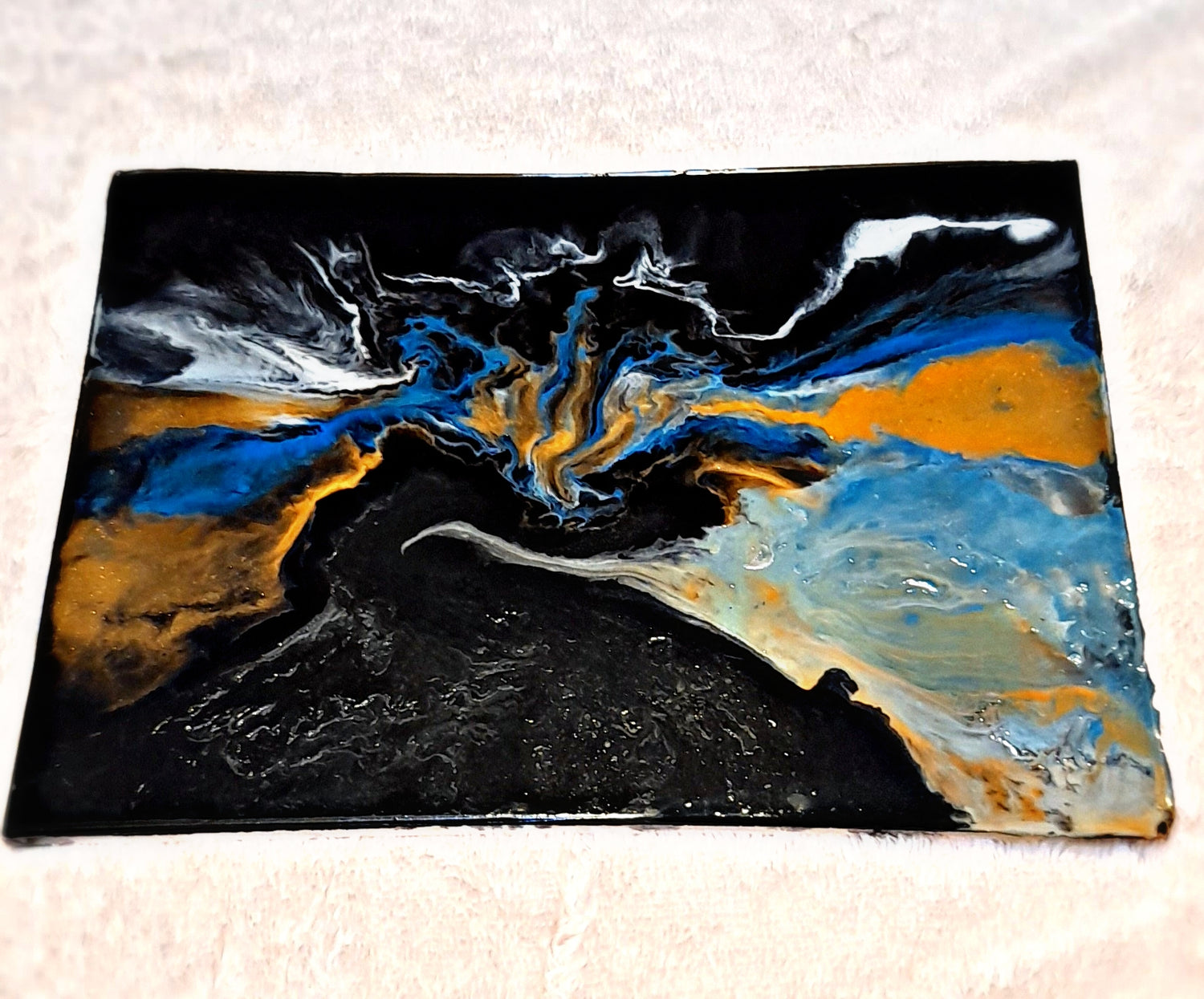 Resin Art is created when a runny chemical called epoxy resin is combined with various colour pigments and additives to produce a blend of unique patterns and textures. The resin mixture gradually hardens (when mixed with a hardener) to a solid plastic as a chemical reaction between its components takes place.