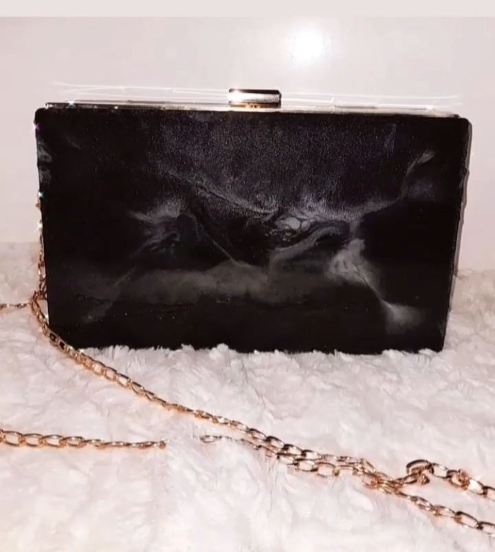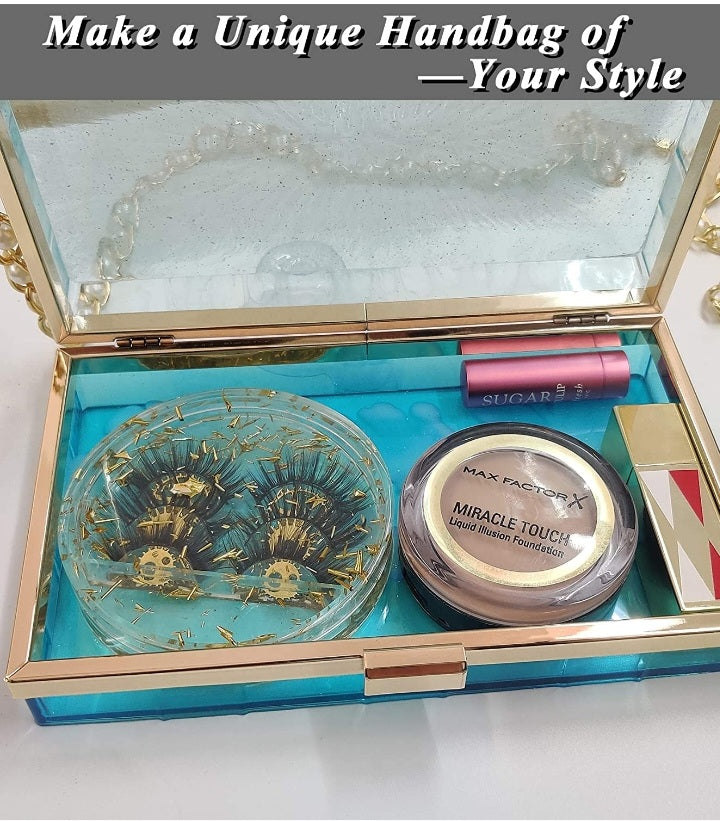 Standard Handmade Resin Clutch Purse using Non-toxic resin that has the durability to last up to 25 years.(1)Gold Strap/Purse chain included with purchase. Clear Acrylic Purse strap(in photo) sold separately on website.