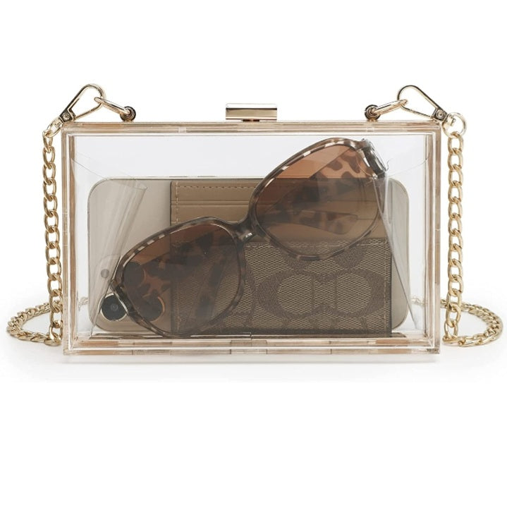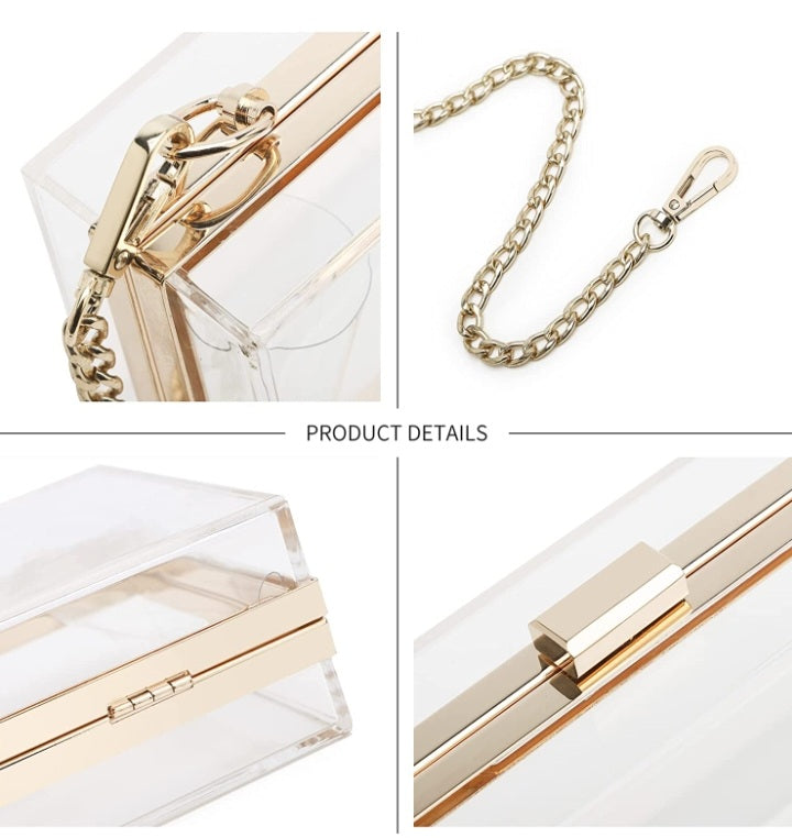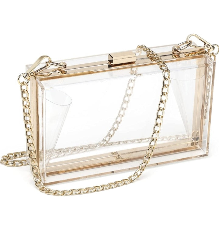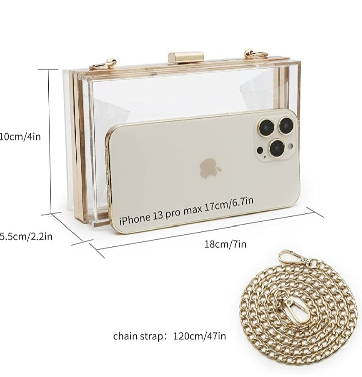 Standard Handmade Resin Clutch Purse using Non-toxic resin that has the durability to last up to 25 years.(1)Gold Strap/Purse chain included with purchase. Clear Acrylic Purse strap(in photo) sold separately on website.