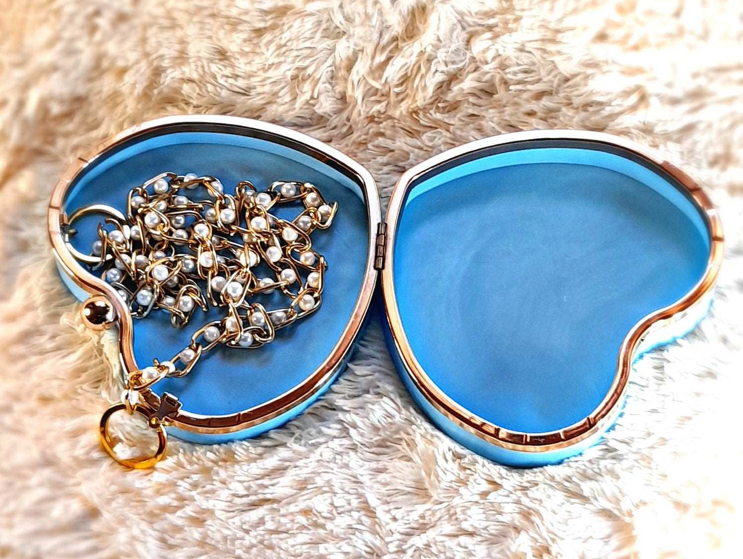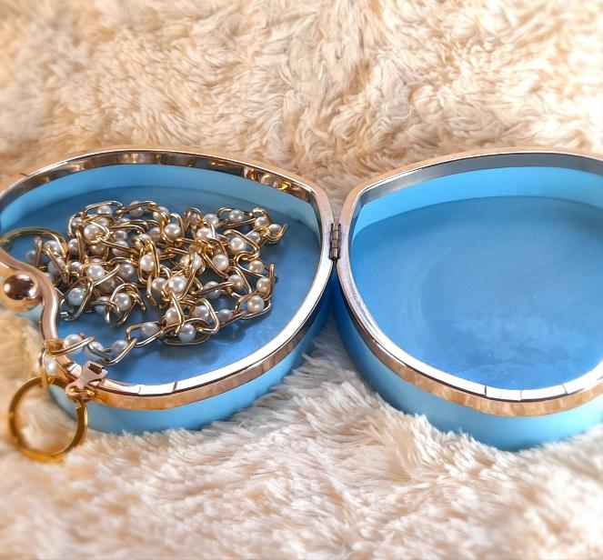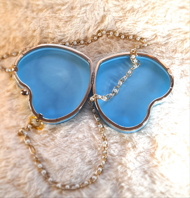 Heart Shaped Handmade Resin Clutch Purse using Non-toxic resin that has the durability to last up to 25 years.(1)Gold Strap/Purse chain included with purchase. Clear Acrylic Purse strap(in photo) sold separately on website.
