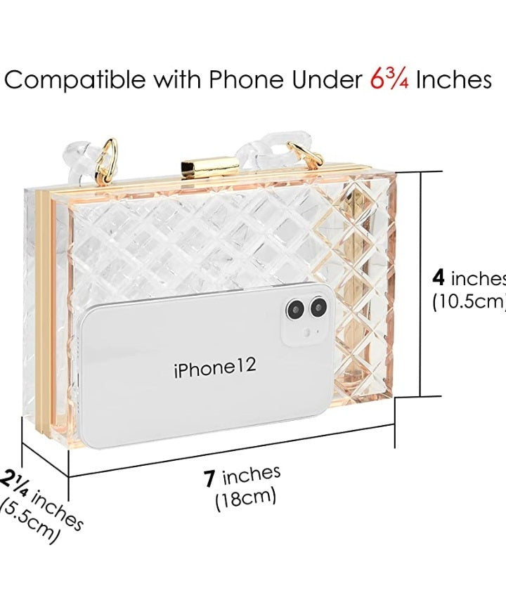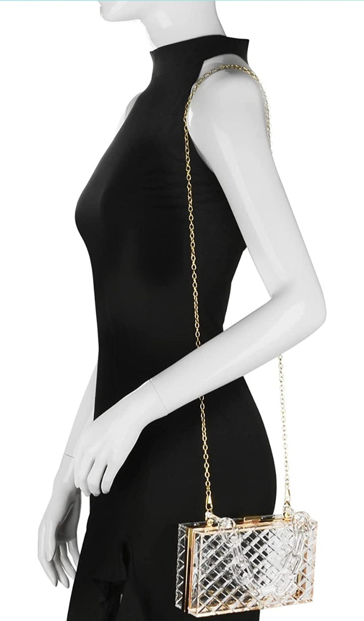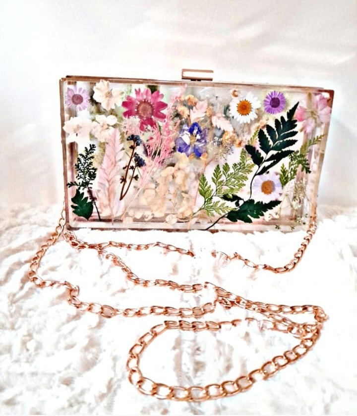 Standard Handmade Resin Clutch Purse using Non-toxic resin that has the durability to last up to 25 years.(1)Gold Strap/Purse chain included with purchase. Clear Acrylic Purse strap(in photo) sold separately on website.
