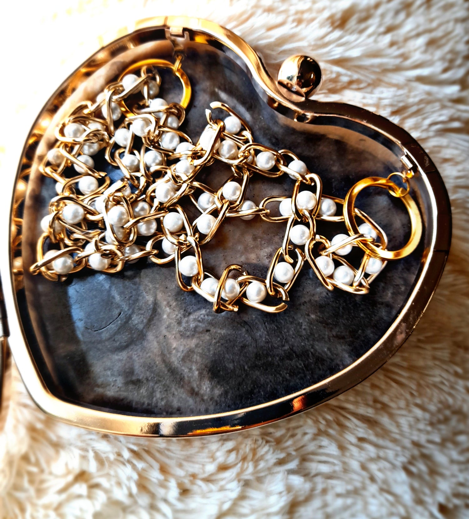 Heart Shaped Handmade Resin Clutch Purse using Non-toxic resin that has the durability to last up to 25 years.(1)Gold Strap/Purse chain included with purchase.Clear Acrylic Purse strap(in photo) sold separately on website.