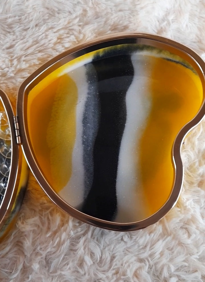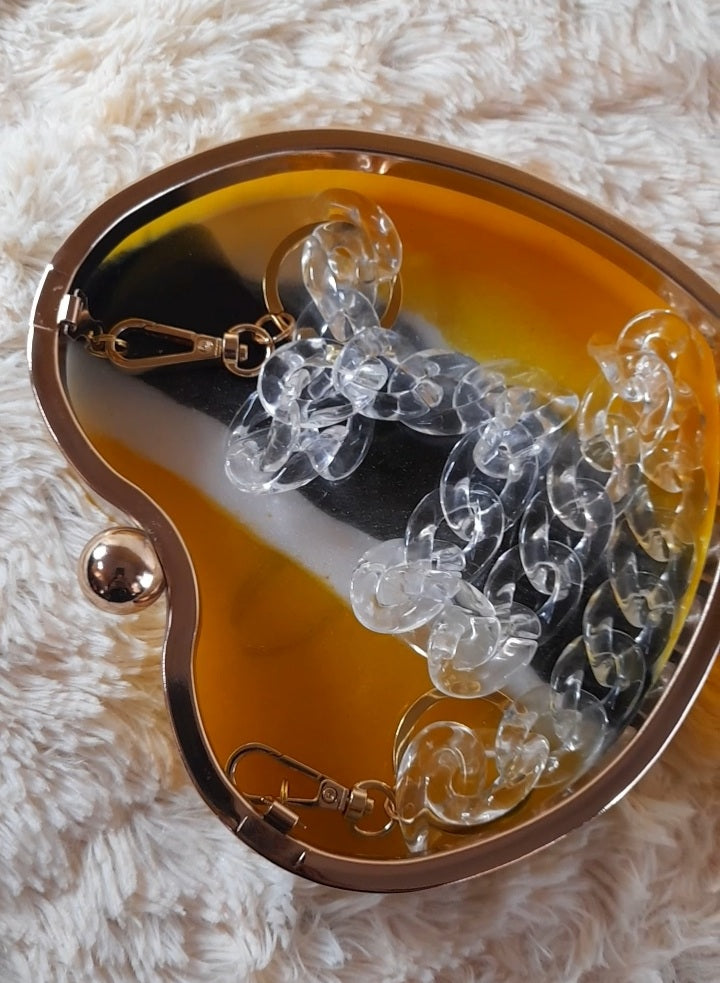 Heart Shaped Handmade Resin Clutch Purse using Non-toxic resin that has the durability to last up to 25 years.(1)Gold Strap/Purse chain included with purchase.Clear Acrylic Purse strap(in photo) sold separately on website.