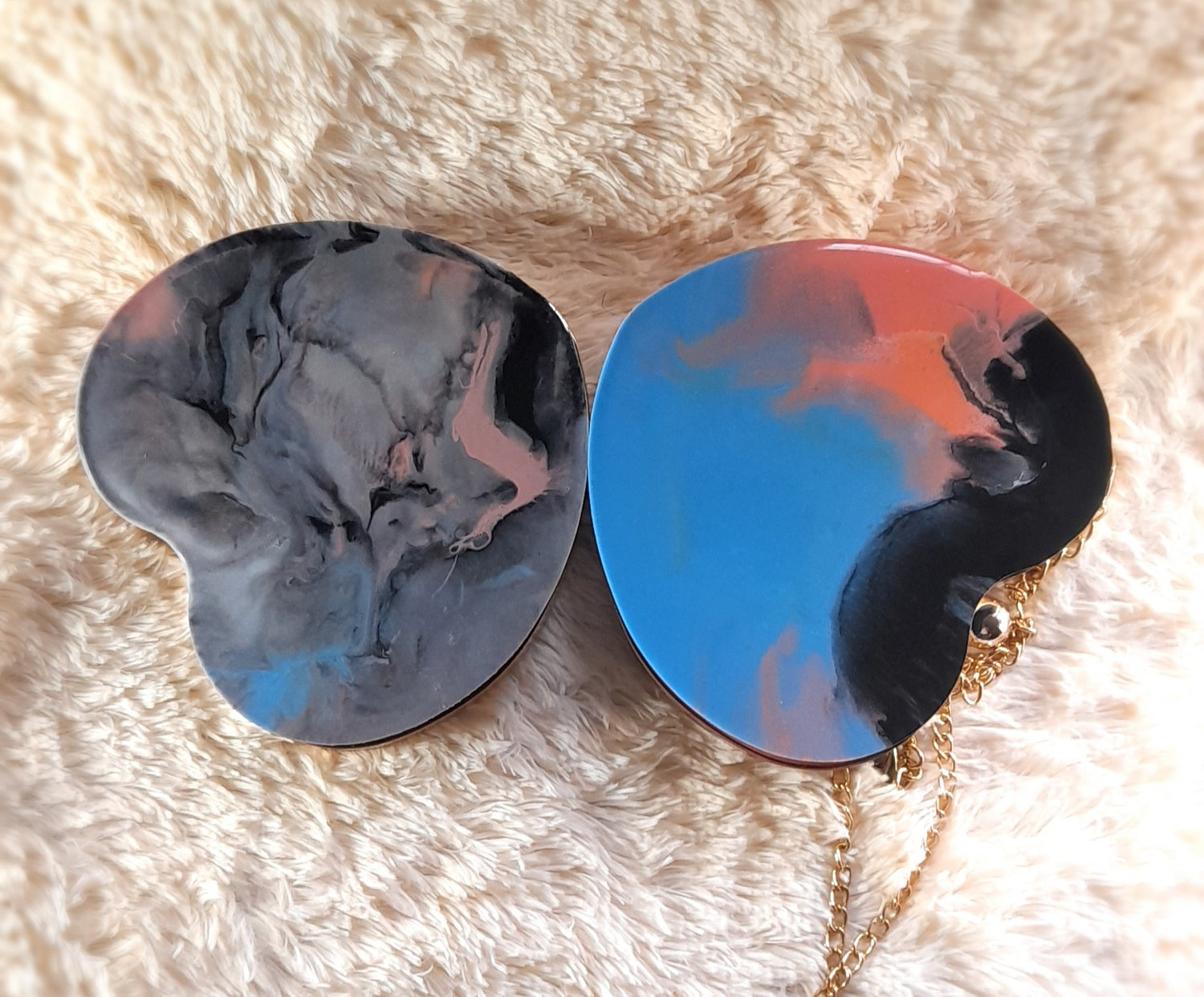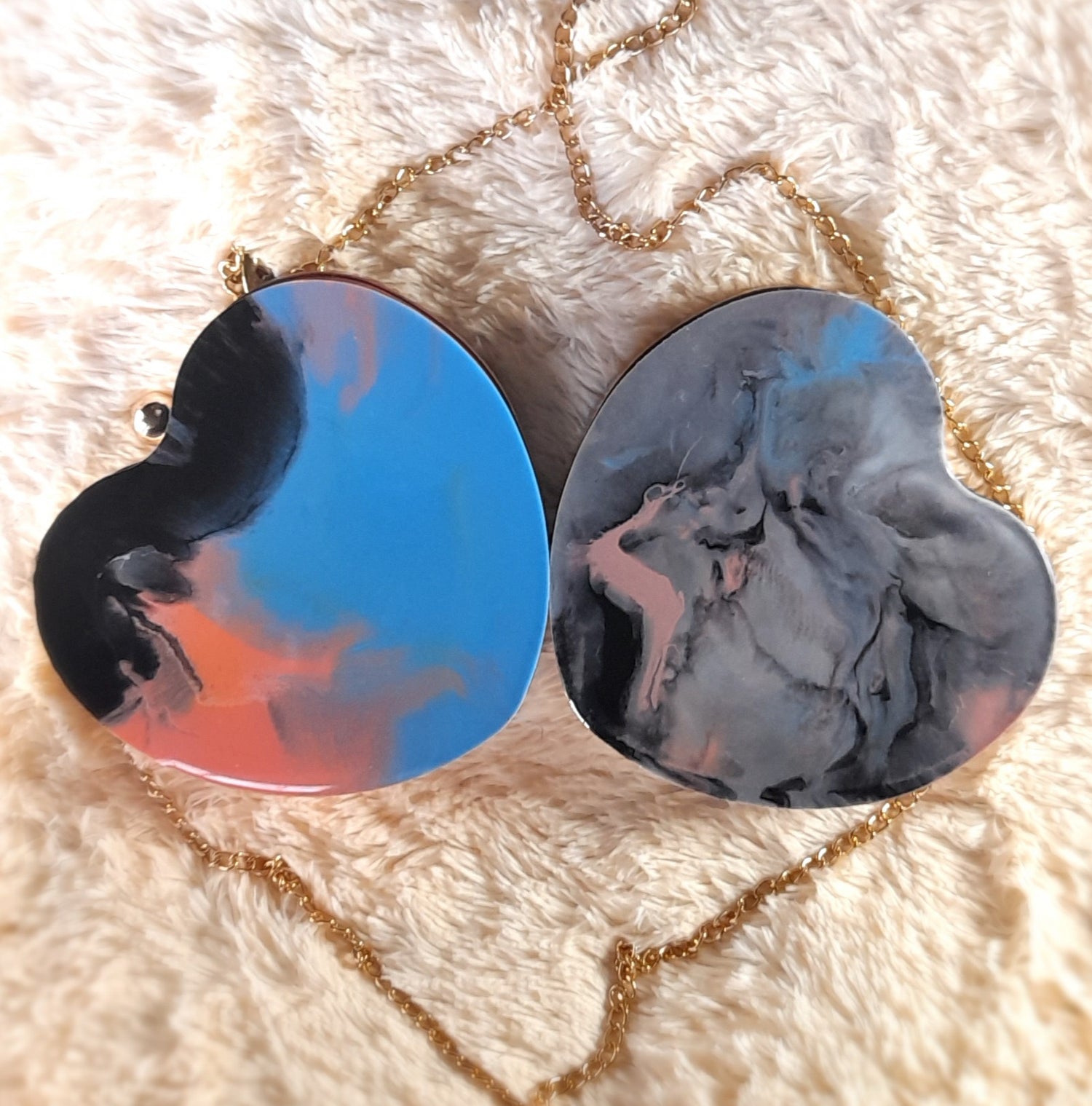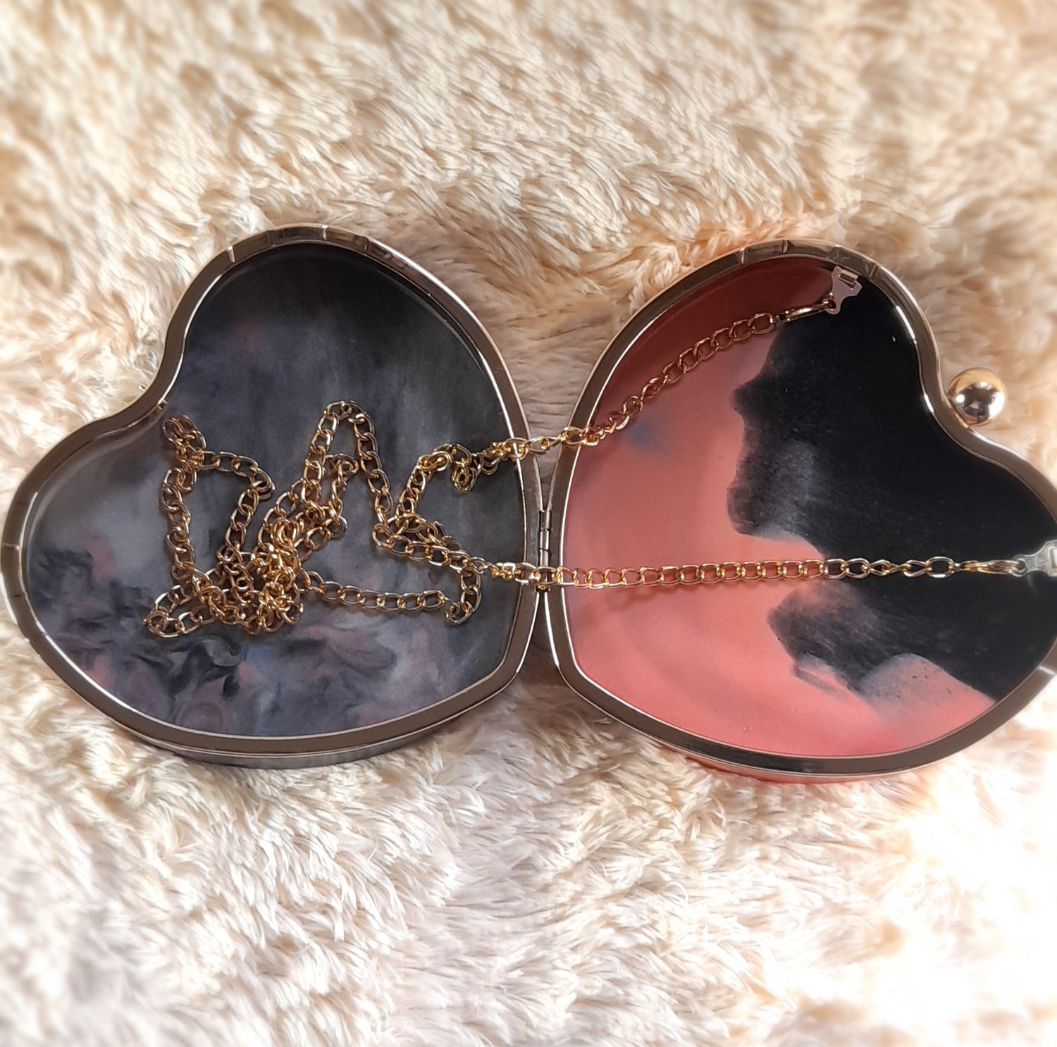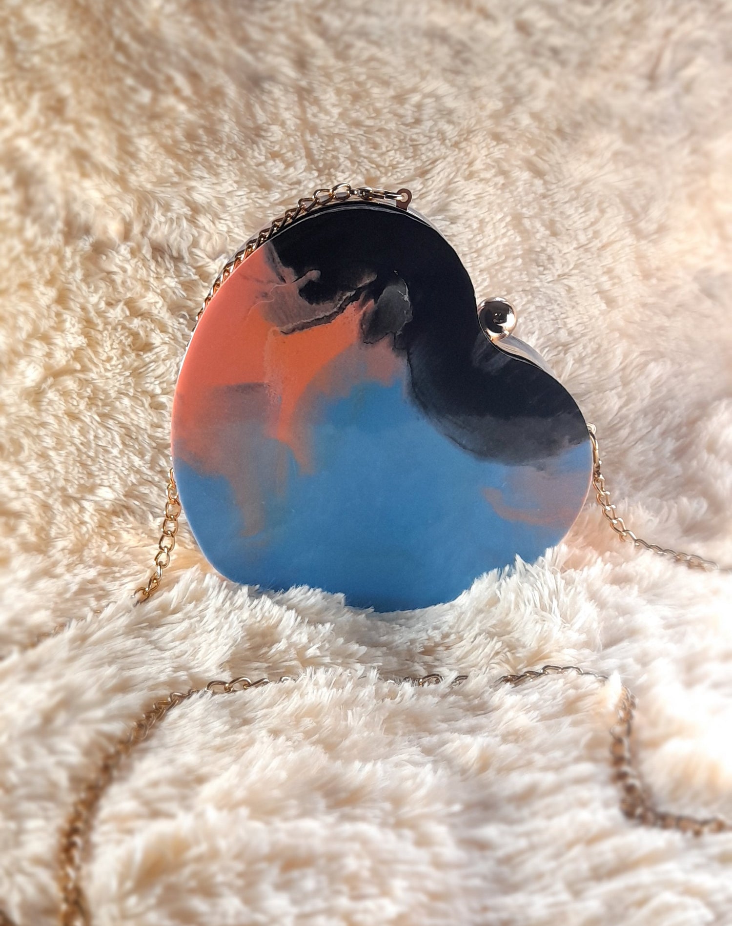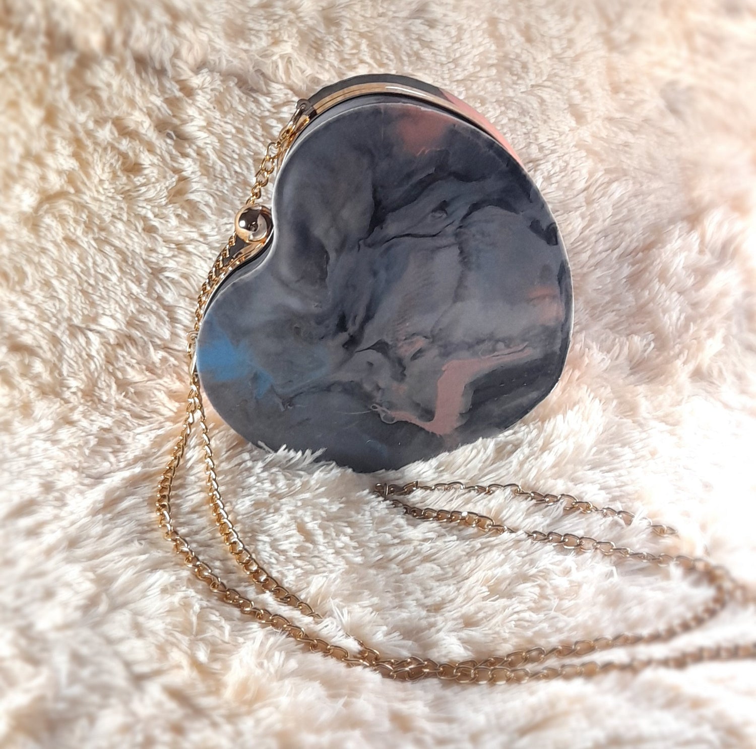 Heart Shaped Handmade Resin Clutch Purse using Non-toxic resin that has the durability to last up to 25 years.(1)Gold Strap/Purse chain included with purchase. Clear Acrylic Purse strap(in photo) sold separately on website.