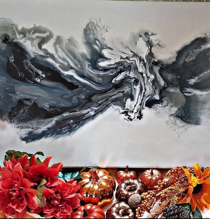 Resin Art is created when a runny chemical called epoxy resin is combined with various colour pigments and additives to produce a blend of unique patterns and textures. The resin mixture gradually hardens (when mixed with a hardener) to a solid plastic as a chemical reaction between its components takes place.