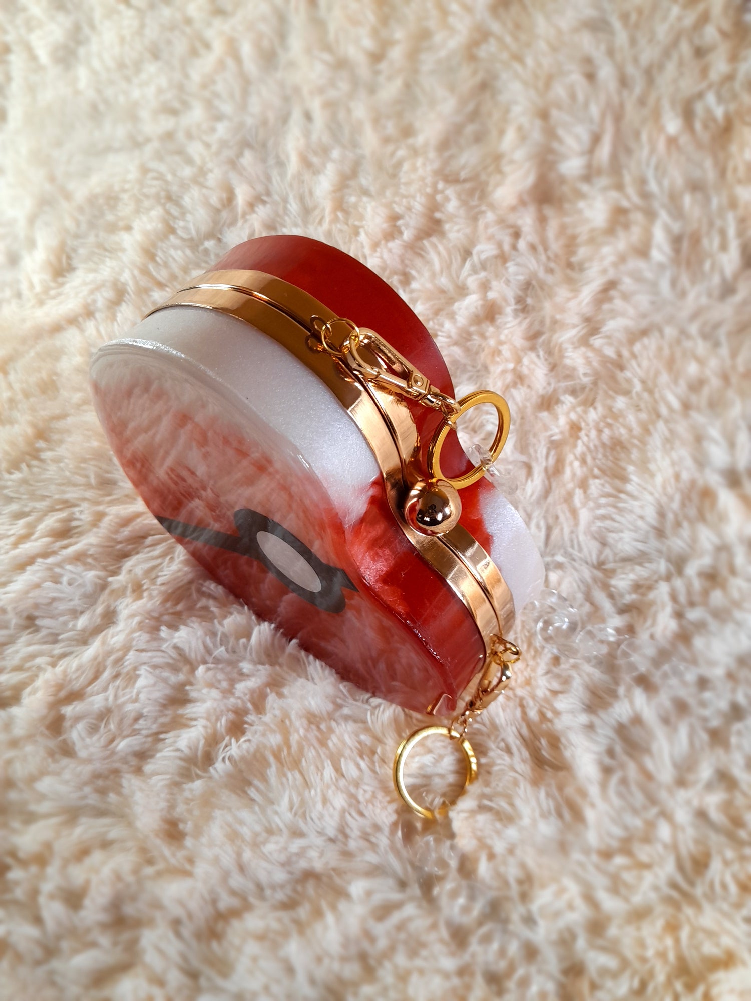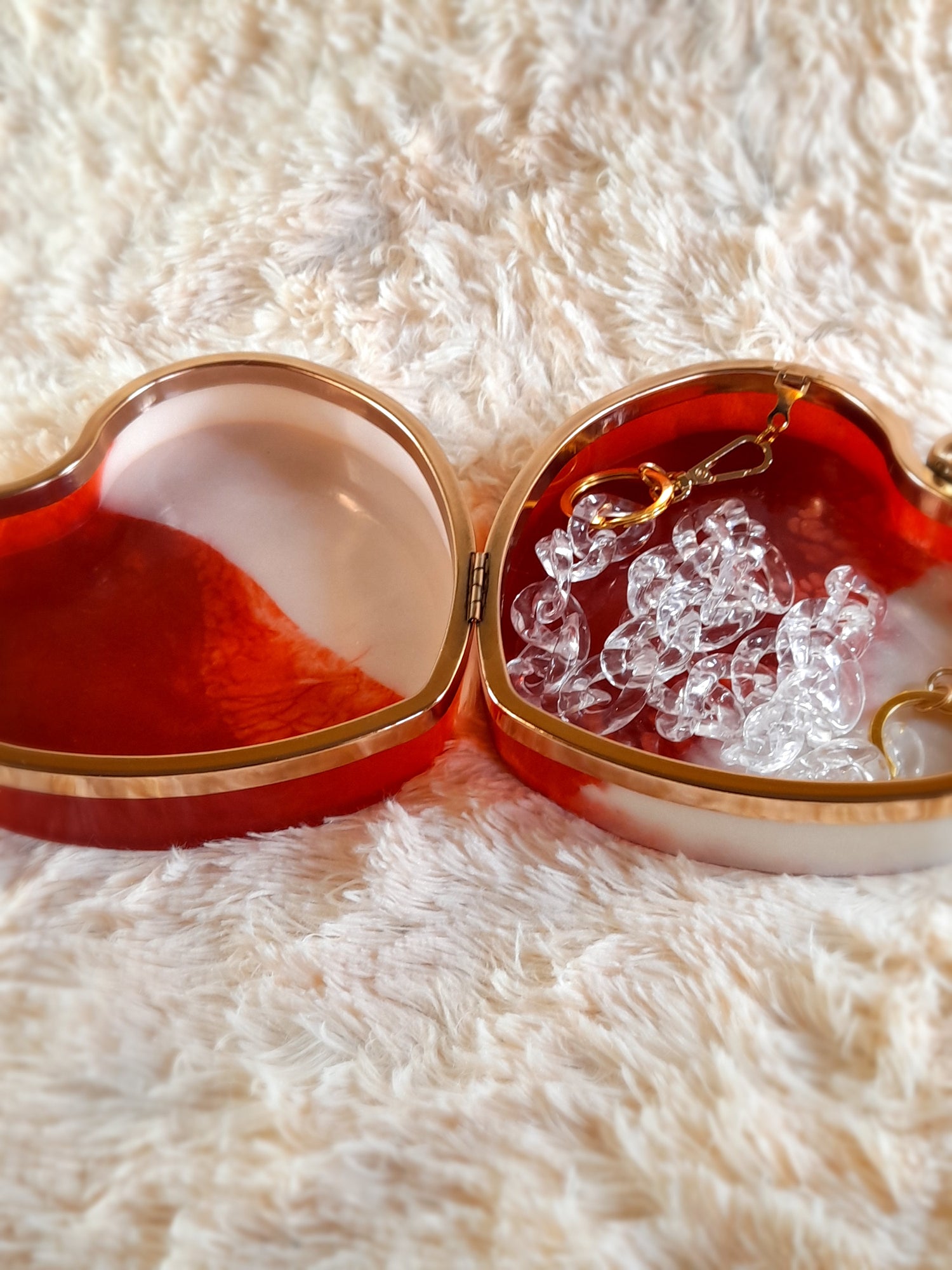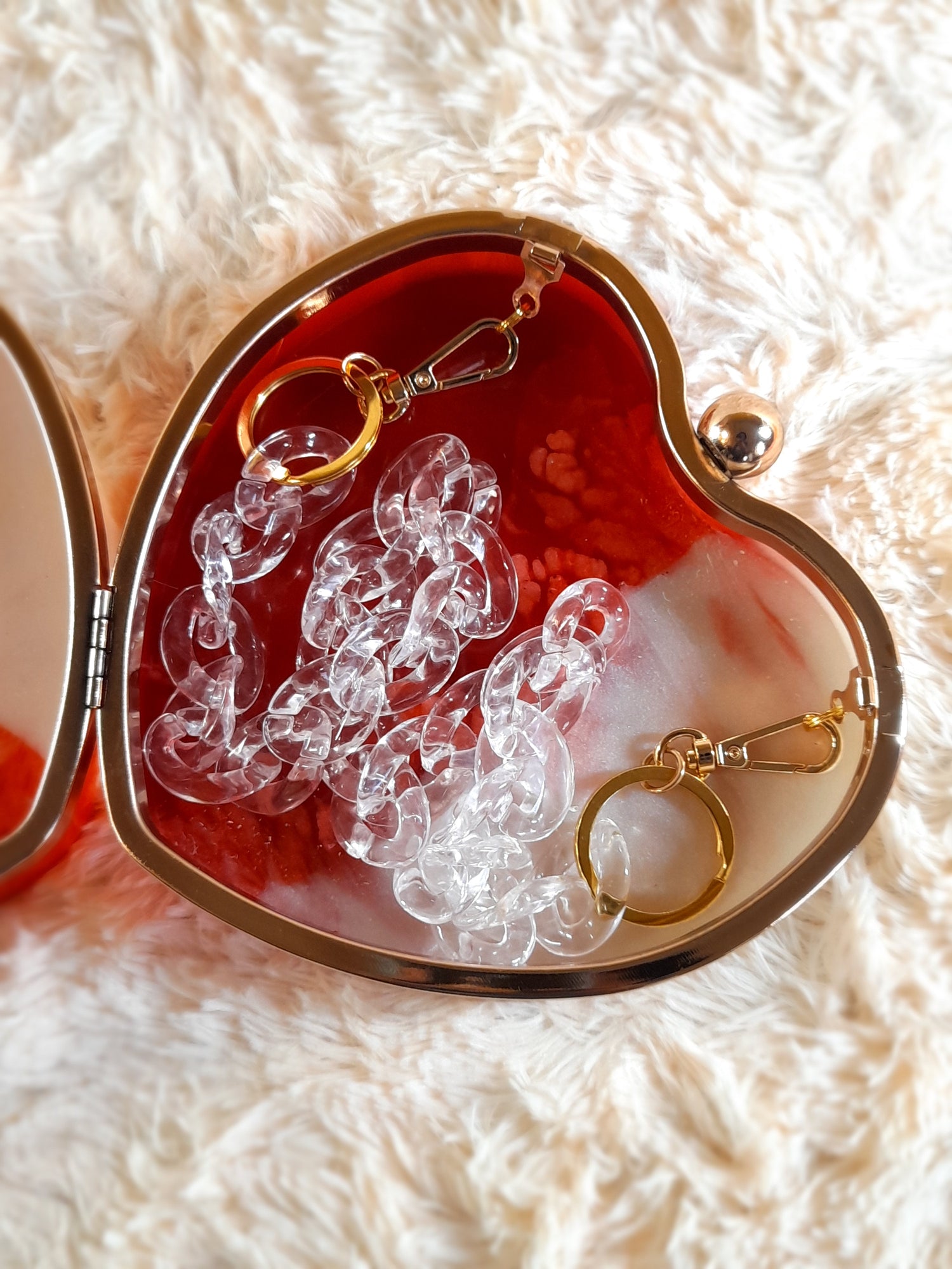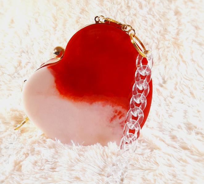 Heart Shaped Handmade Resin Clutch Purse using Non-toxic resin that has the durability to last up to 25 years.(1)Gold Strap/Purse chain included with purchase.Clear Acrylic Purse strap(in photo) sold separately on website.