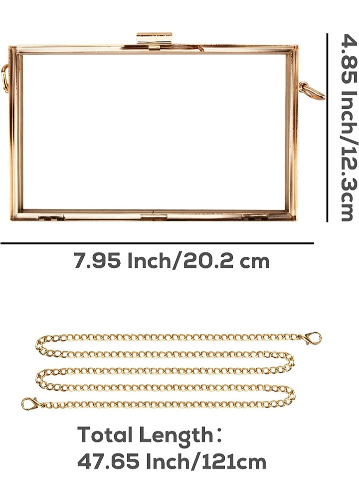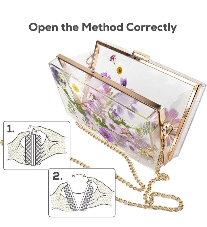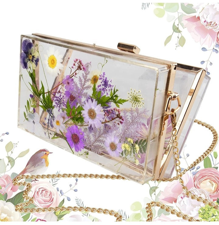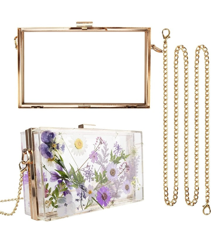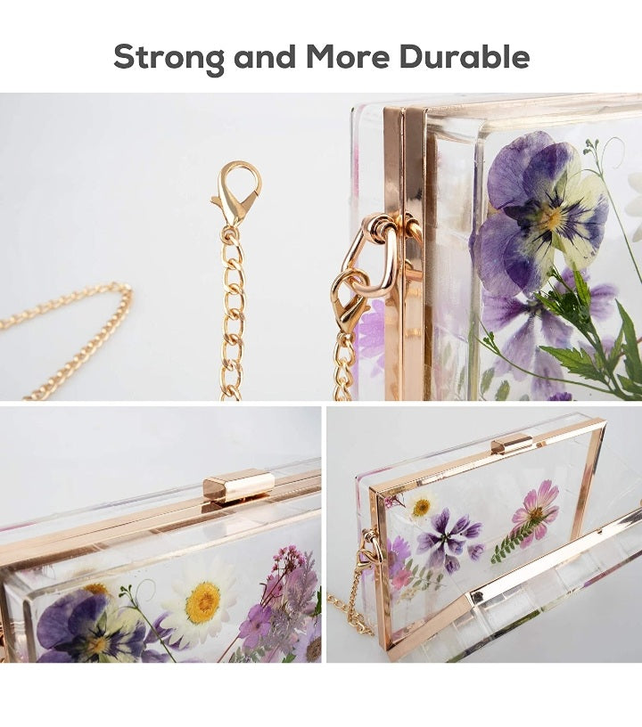 Standard Handmade Resin Clutch Purse using Non-toxic resin that has the durability to last up to 25 years.(1)Gold Strap/Purse chain included with purchase. Clear Acrylic Purse strap(in photo) sold separately on website.