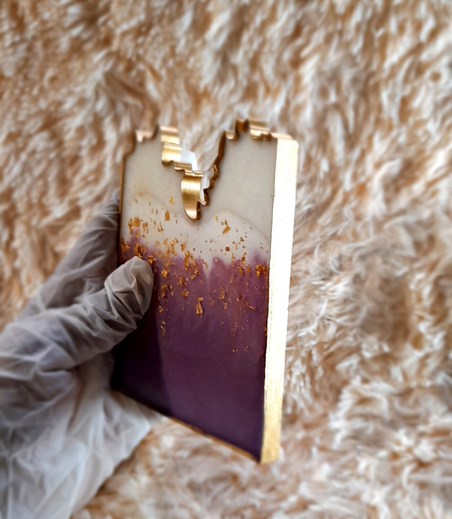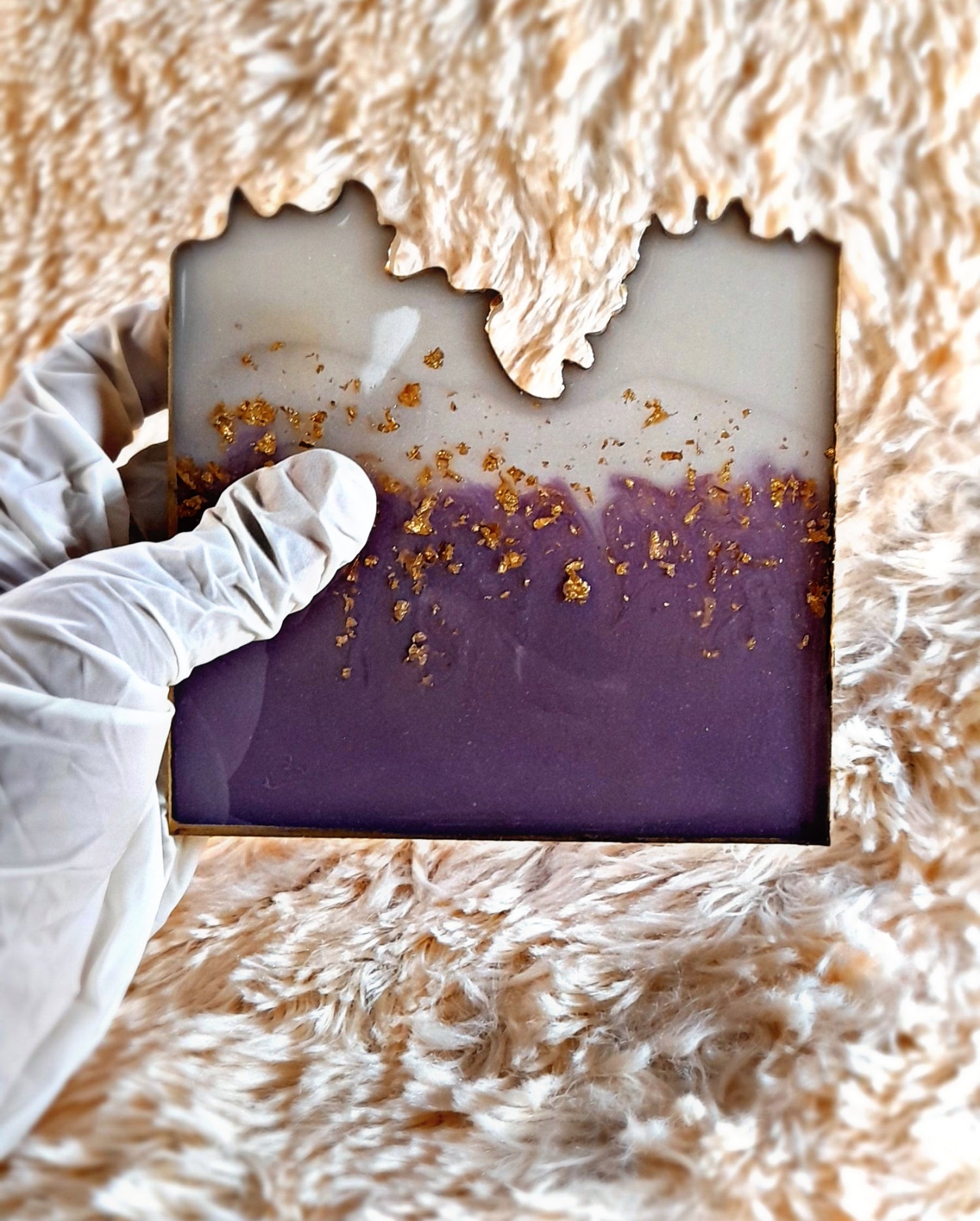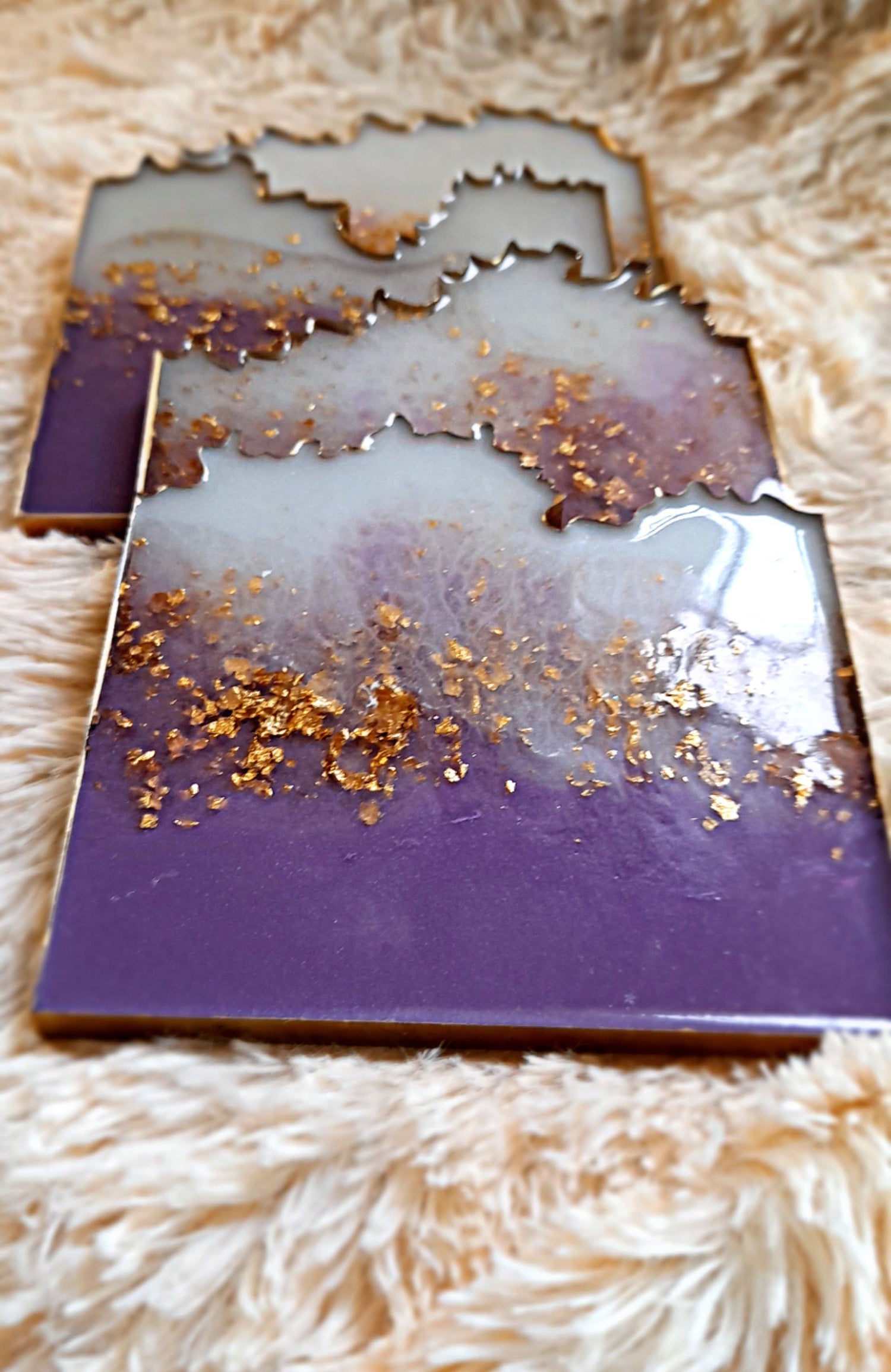 Handmade Resin Coasters: Purple & White, Square geodes, gold flakes, all hand