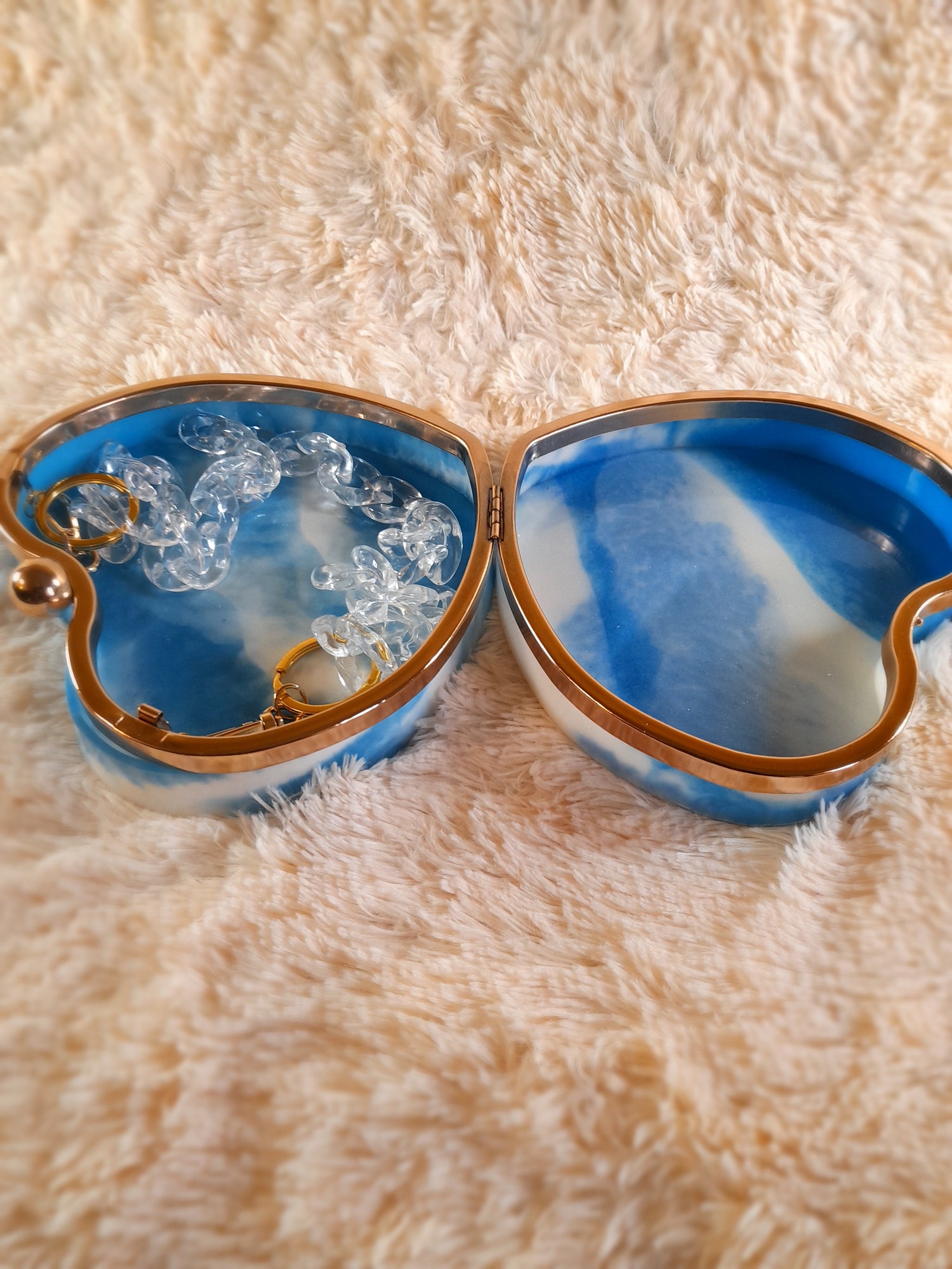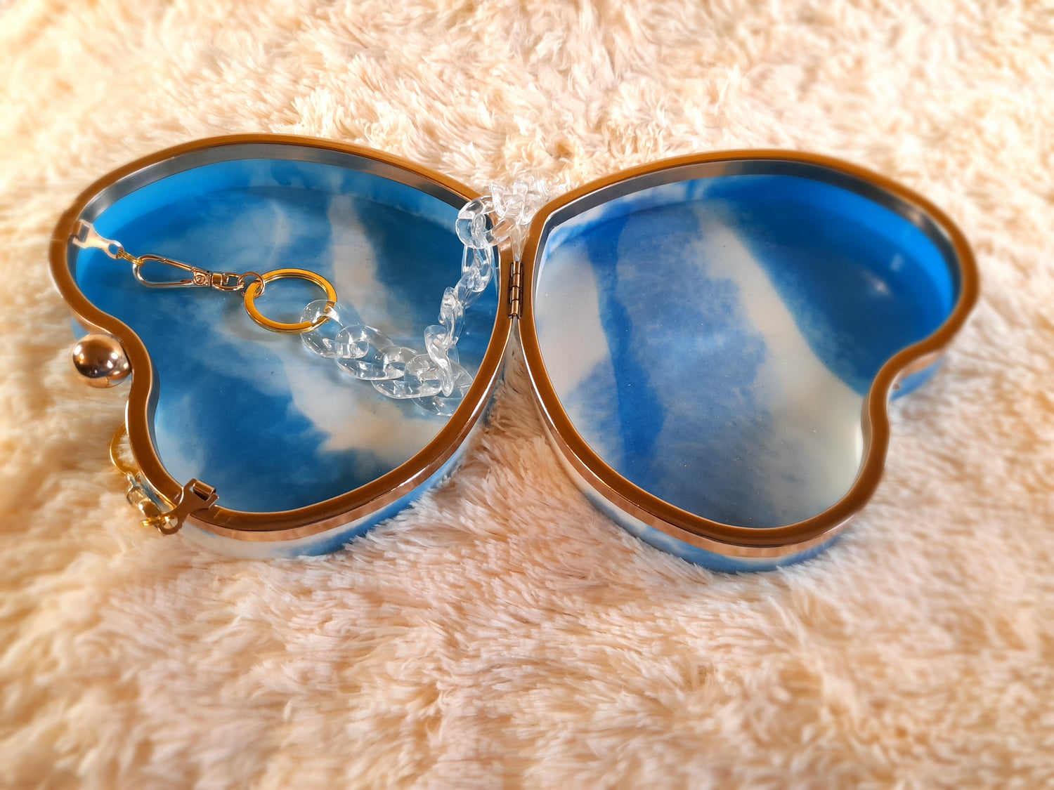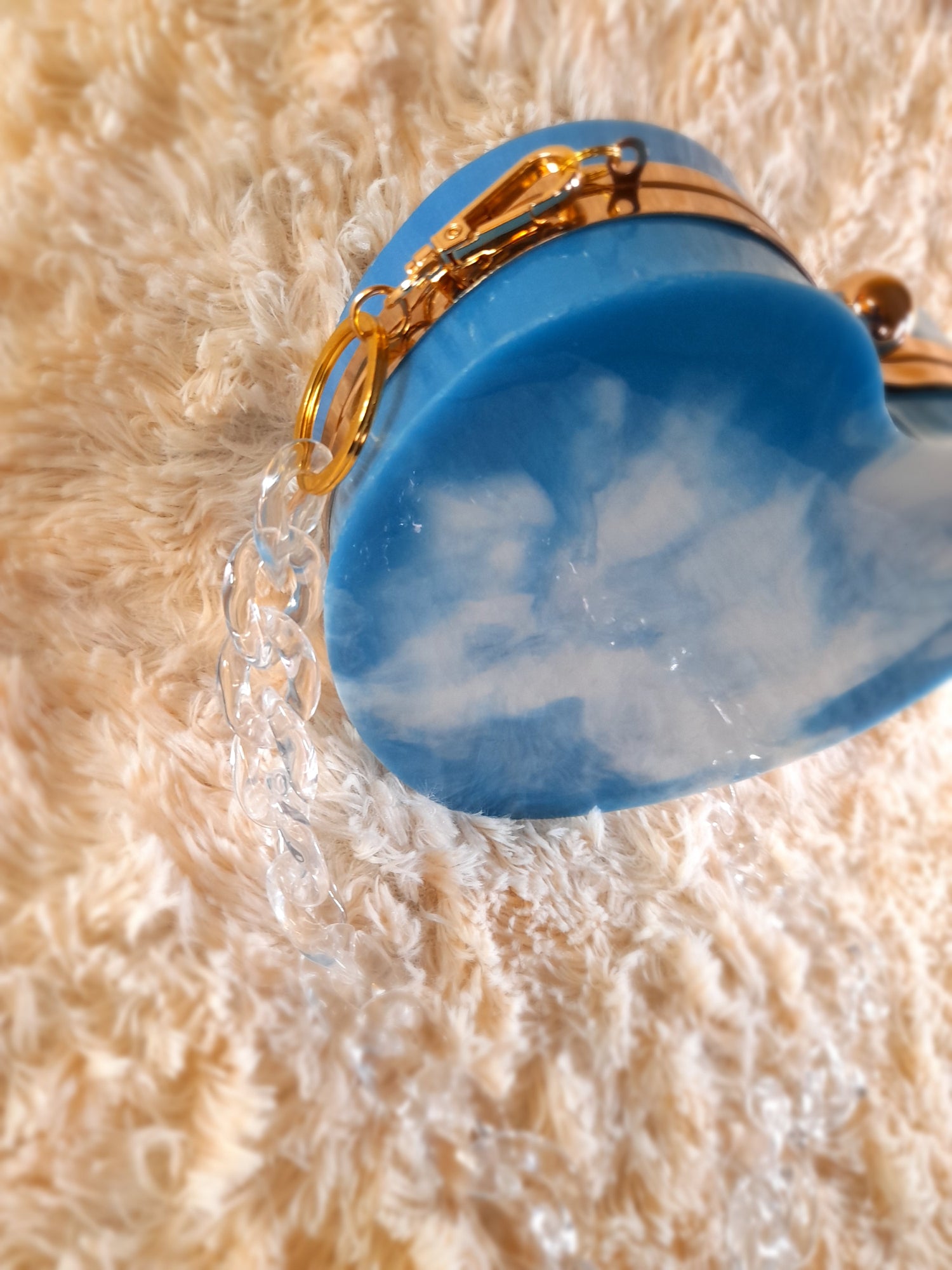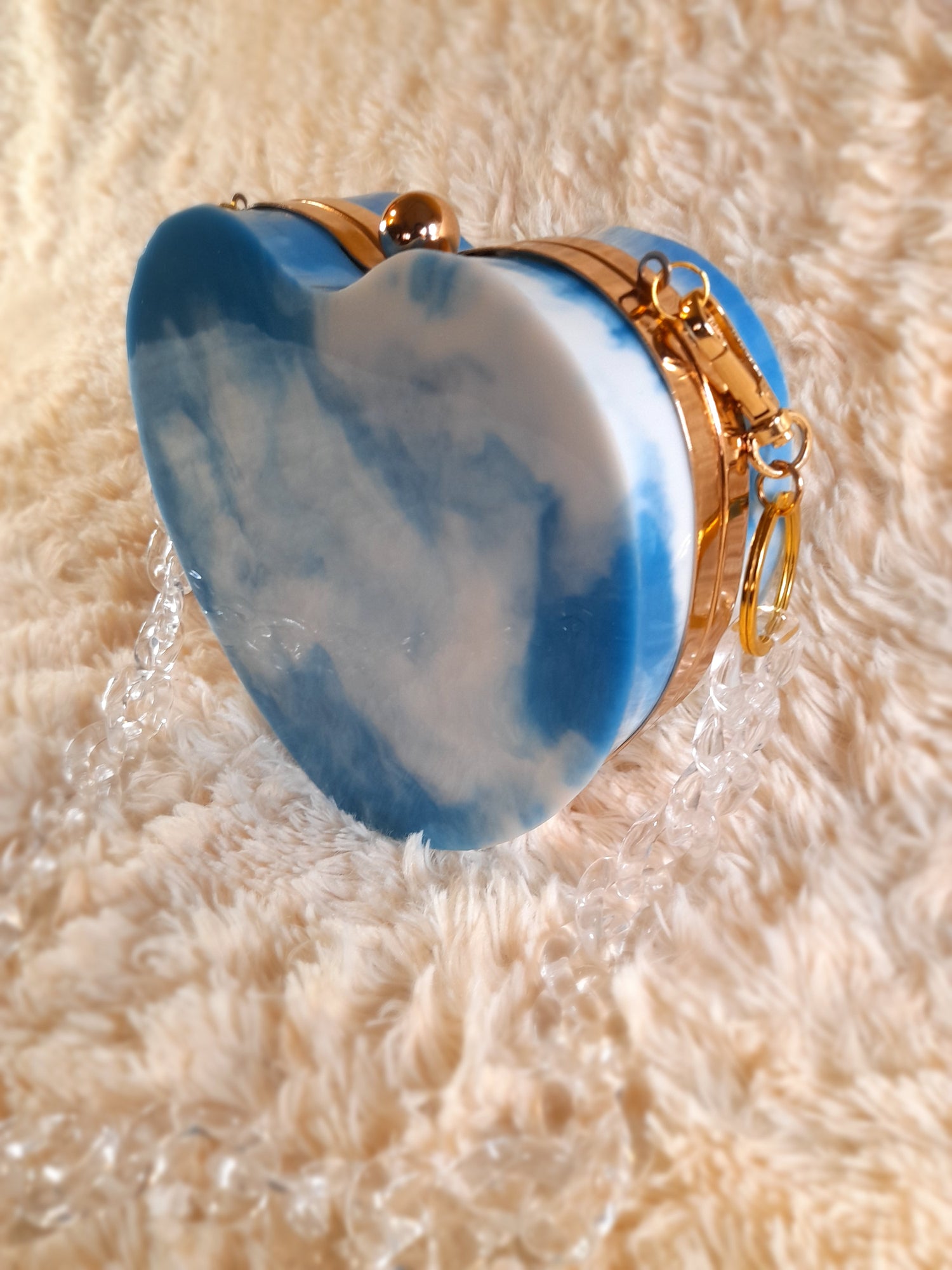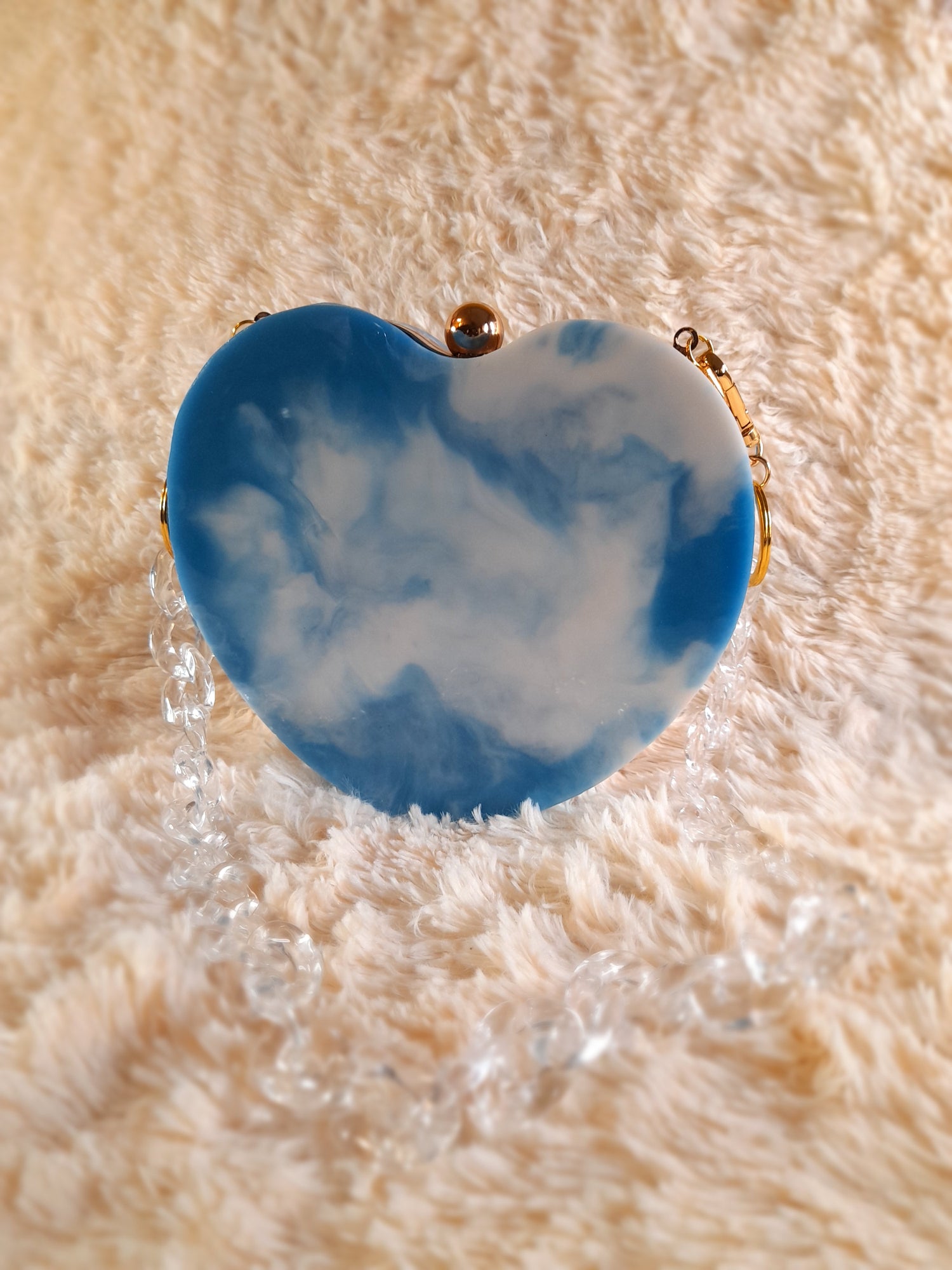 Heart Shaped Handmade Resin Clutch Purse using Non-toxic resin that has the durability to last up to 25 years.(1)Gold Strap/Purse chain included with purchase. Clear Acrylic Purse strap(in photo) sold separately on website.