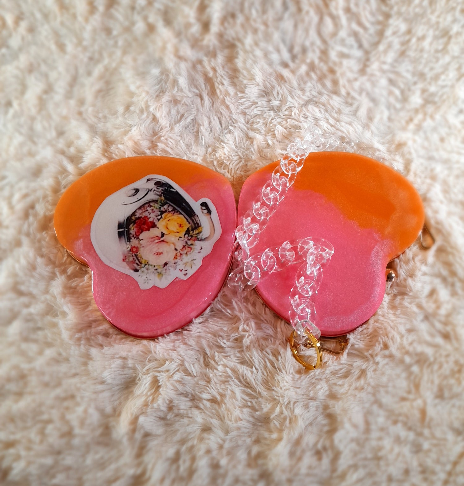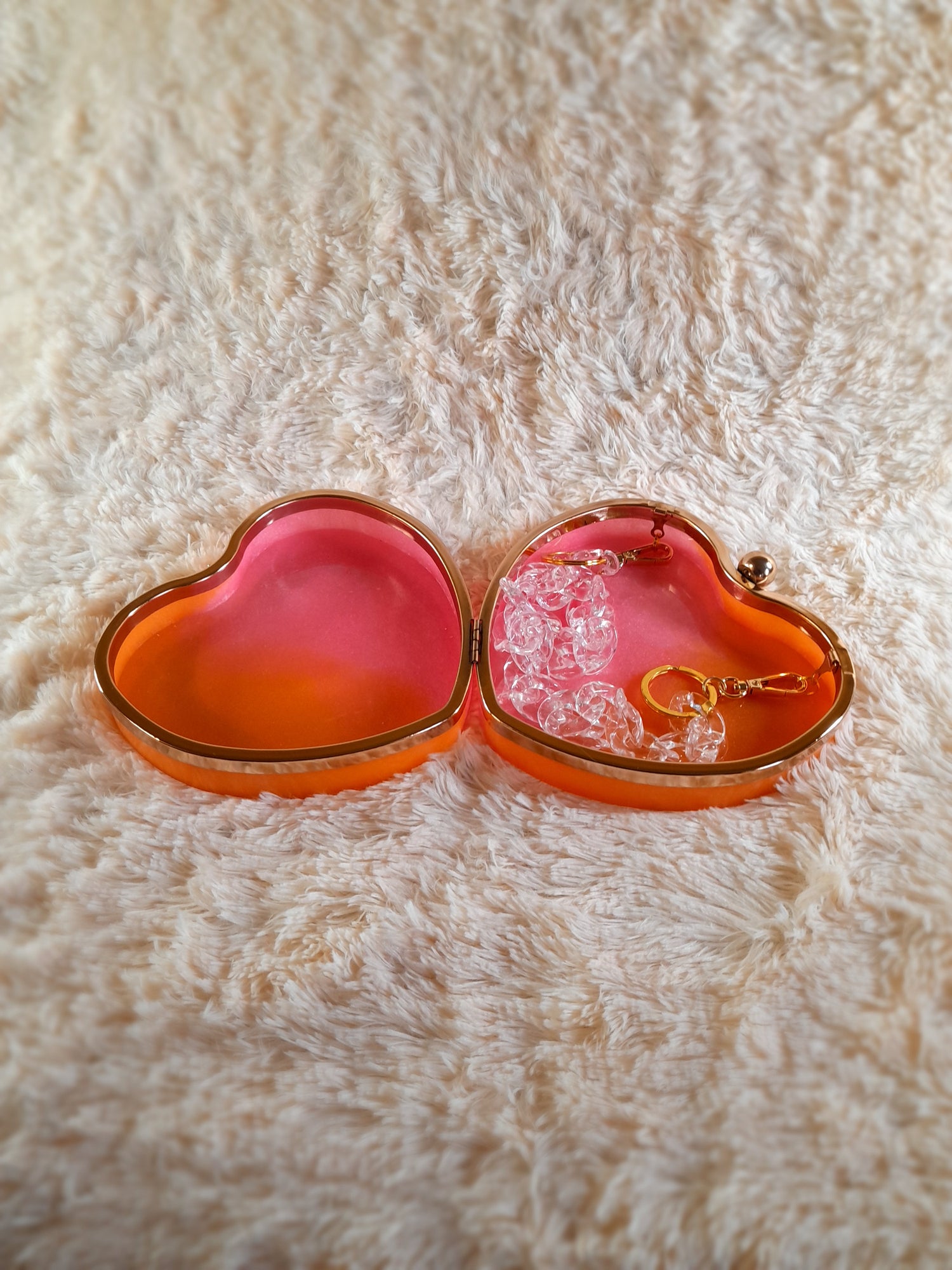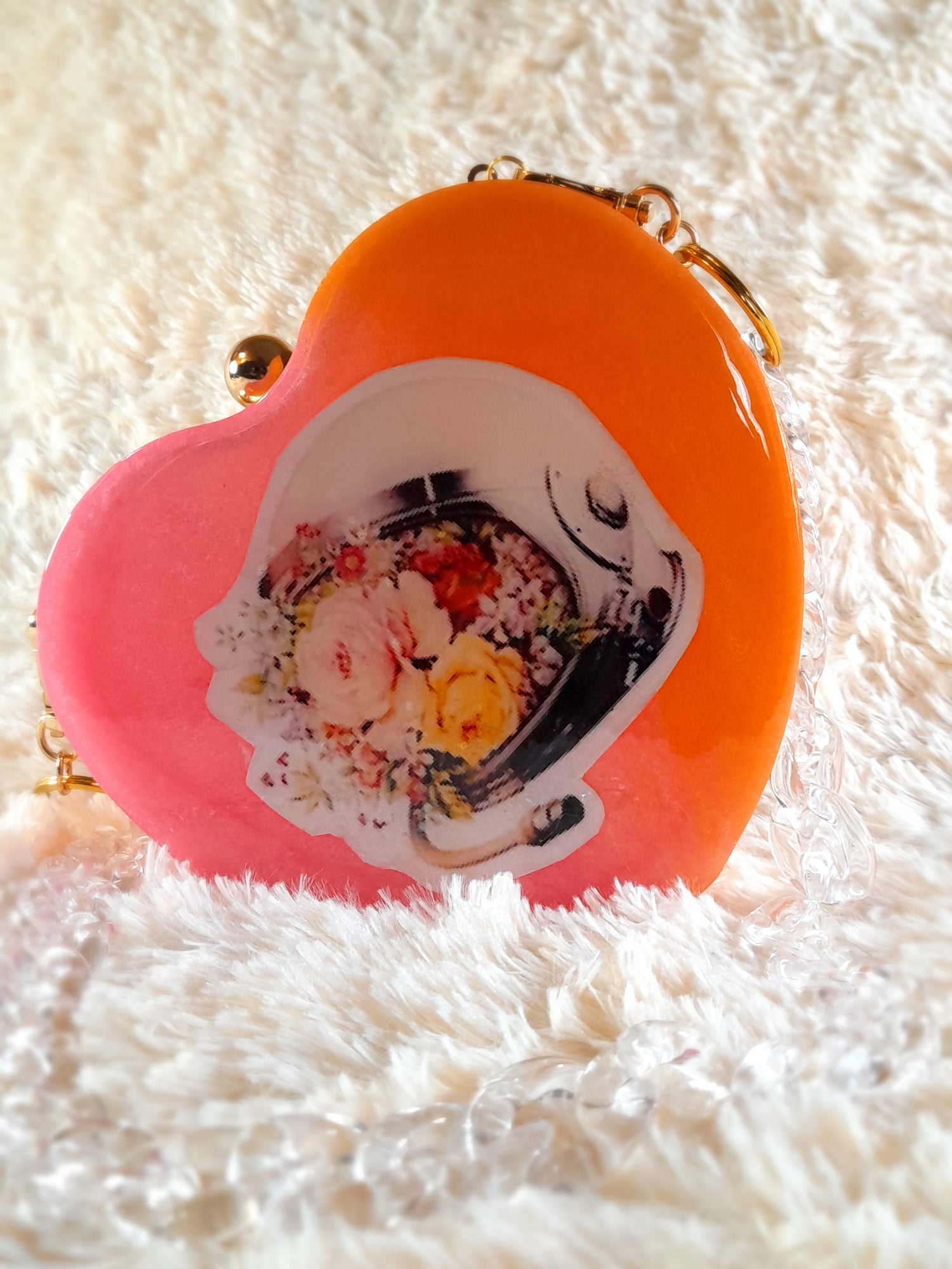 Heart Shaped Handmade Resin Clutch Purse using Non-toxic resin that has the durability to last up to 25 years.(1)Gold Strap/Purse chain included with purchase.Clear Acrylic Purse strap(in photo) sold separately on website.