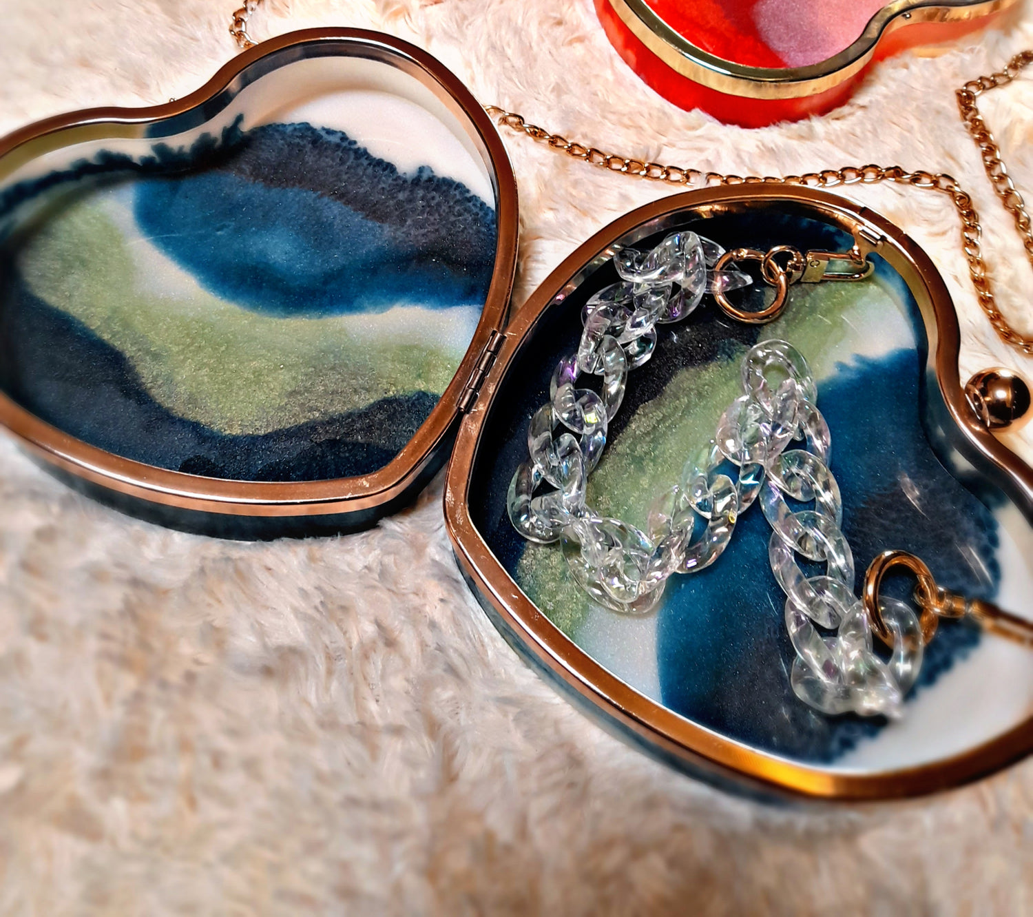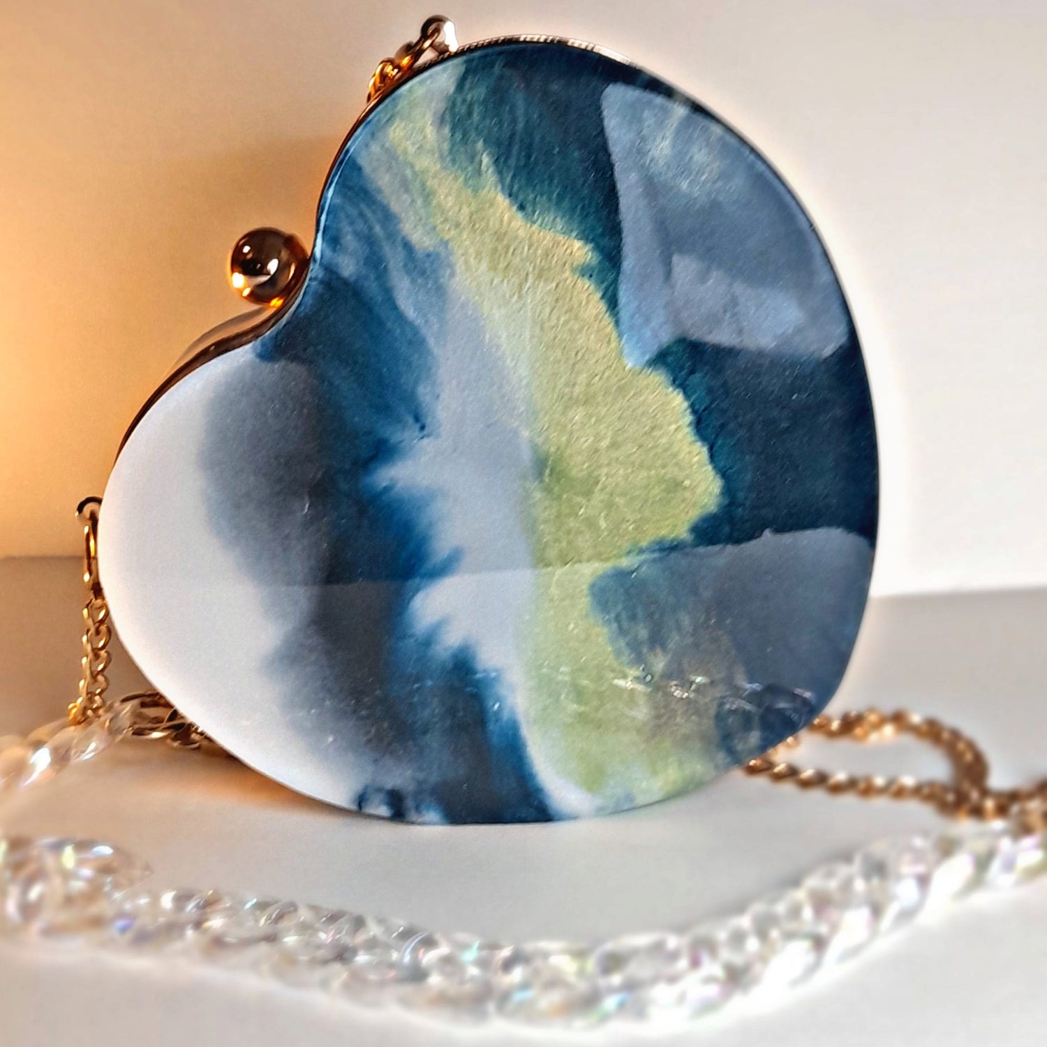Heart Shaped Handmade Resin Clutch Purse using Non-toxic resin that has the durability to last up to 25 years.(1)Gold Strap/Purse chain included with purchase. Clear Acrylic Purse strap(in photo) sold separately on website.